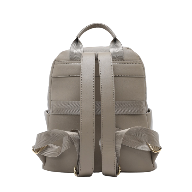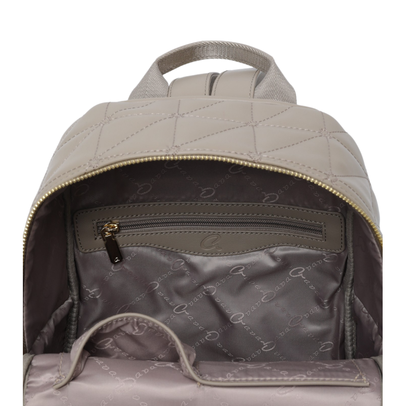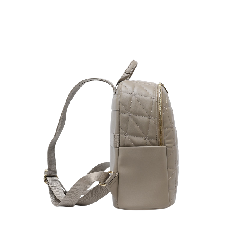 Garbina women's backpack made of high-quality faux leather with 'a' seams that give it a quilted texture. Designed in big size to provide capacity and comfort in organization. Secures with double metal zipper in gold hue. Inside it is lined and contains one closed zip case and two open ones for small items. Outside it has compartments on the sides, wide back straps that can be adjusted, and an extra strap for attaching on a suitcase. A very special backpack, with a distinctive look, suitable for every style.
