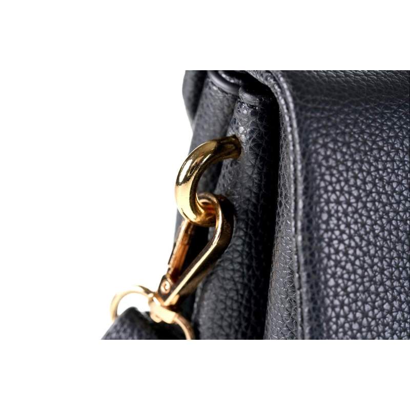 Product Design Metallic details Cases-Pockets Inner cases,Inner pocket with zipper Closure Magnetic click,Flap Top Handle Type Adjustable Strap Product Type Crossbody Product Material Artificial Leather,Lining,Color combination Width 9cm Length 31cm Height 27cm Size Large
